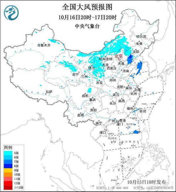 r10月16日20时至17日20时,内蒙古中西部和东南部、青海北部、陕西中北部、河北北部、辽宁西部和南部等地的部分地区有5~6级、阵风7~9级的大风;渤海、黄海中部部分海域将有7~8级、阵风9级的大风。